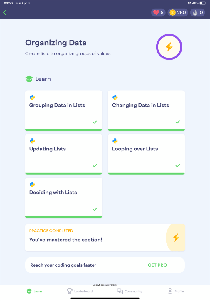 The lessons are arranged systematically. It also helps that for each lesson, I get to immediately ‘apply’ in some code blocks what I learn. There’s a short quiz in each section that helps me recall concepts and because of its gamified system, the quizzes are fun, entertaining, yet still challenging.
