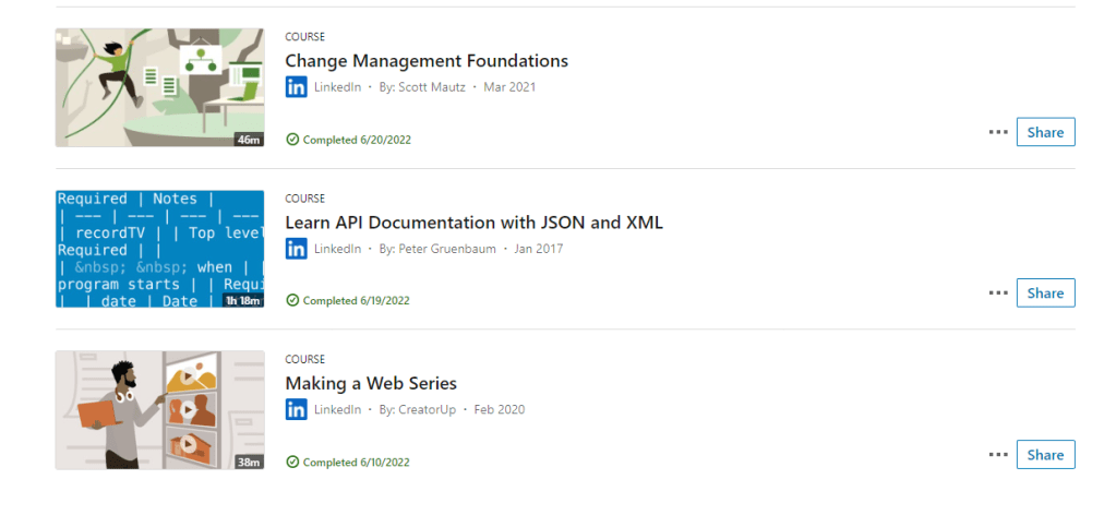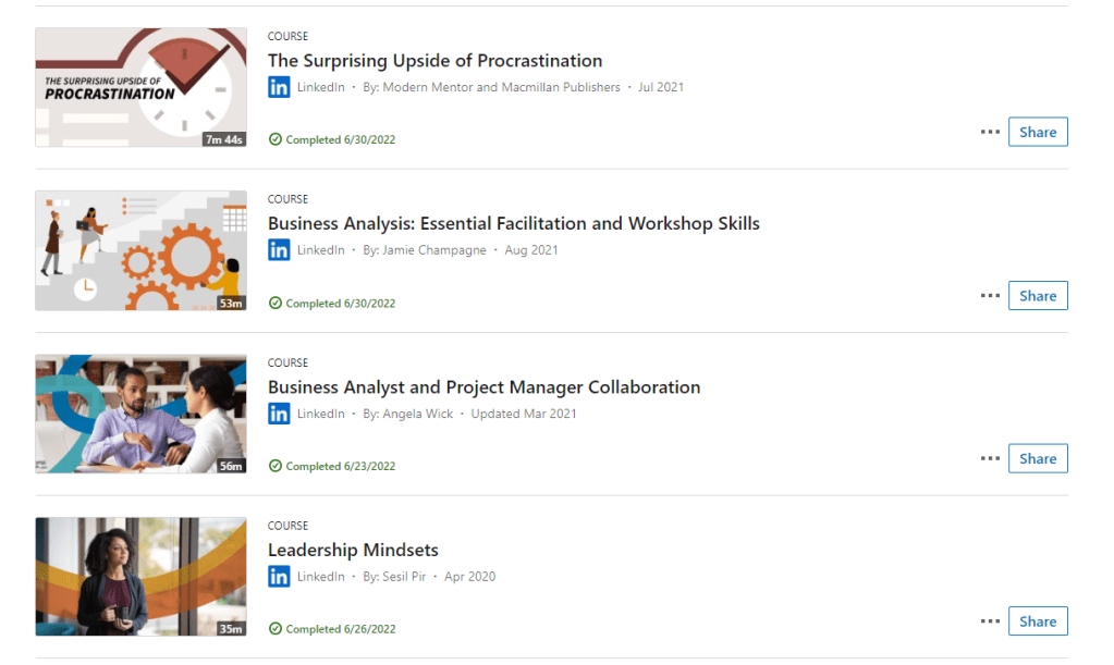 I managed to finish 14 courses in the span of thirty days and as mentioned they are all relevant to my current job and the skills I want to focus on. However, I want to highlight that LinkedIn Learning also provides an array of courses for different skillsets and interests. For example, you can see I also took a short course on Making a Web Series and The Surprising Upside of Procrastination (as if I need an excuse to procrastinate).