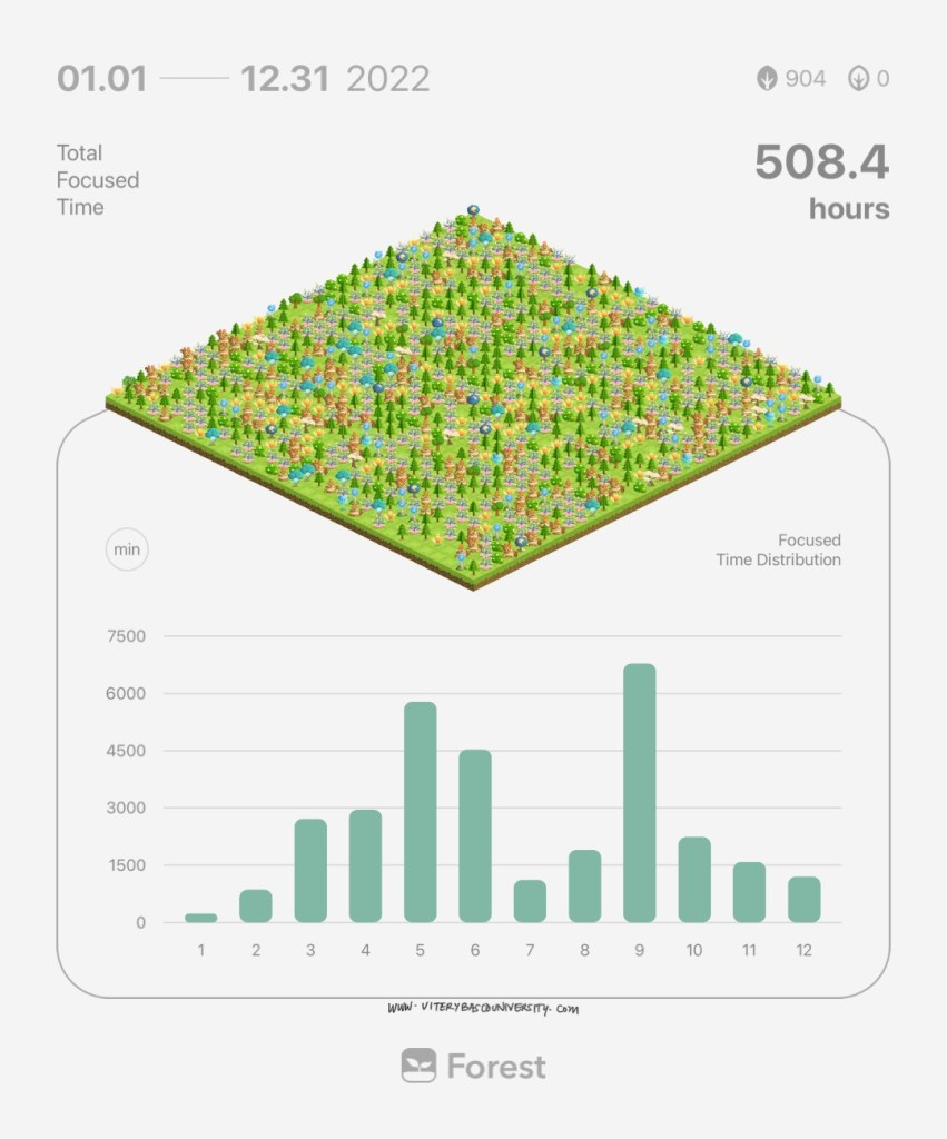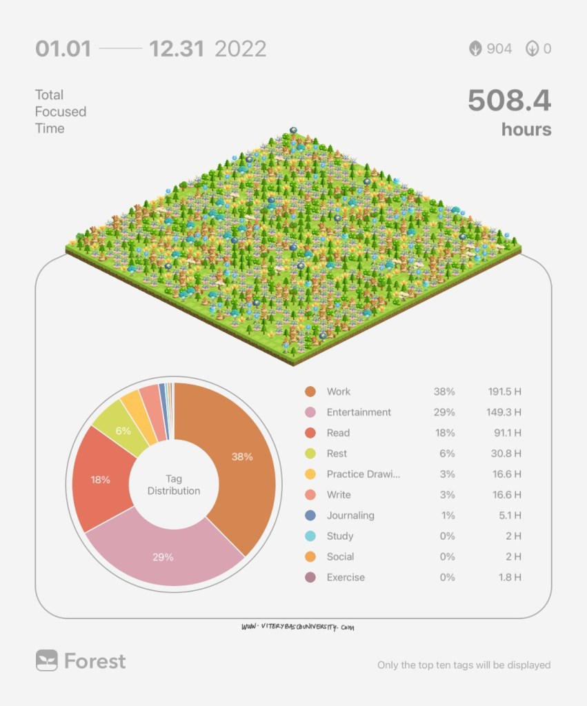 According to Forest App, or to be more accurate, according to how often I remembered to trigger the application as I went with my activities, I had a good amount of focus logged in 2022, peaking in September. I find that the inaccuracy in this app is caused by my inability to be consistent in using it rather than a lack of focus. Nonetheless, through the app I managed to see how much I don’t use it relatively measure how much time I spent on various activities.