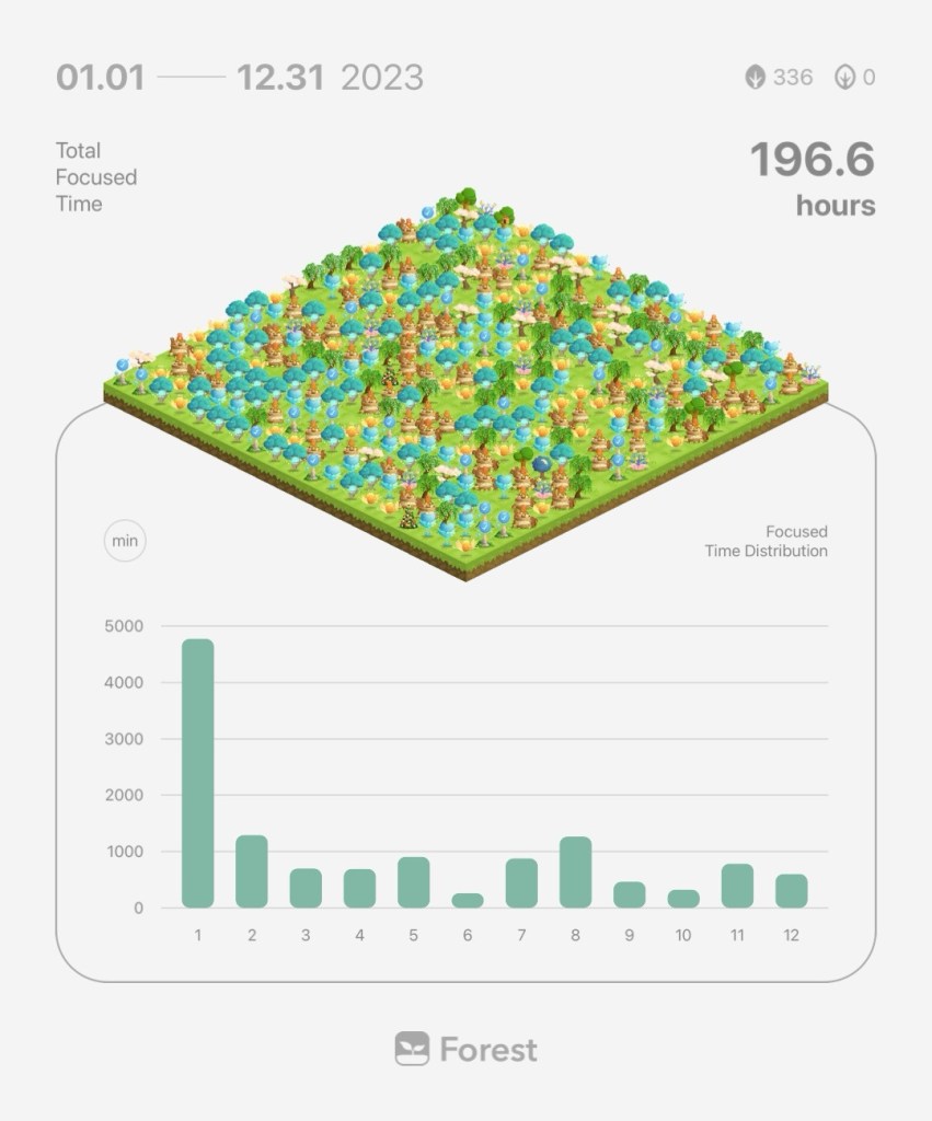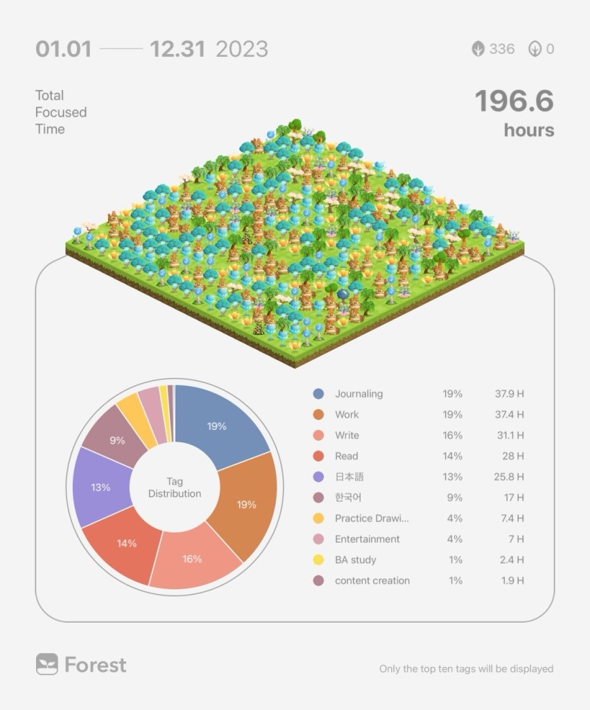 Compared to 2022, my Forest trees were 600 fewer, an expected result considering I stopped recording my ‘Work’ focus hours in January 2023. However, comparing my Writing focus stats in 2022 and 2023, there was a significant improvement. Remembering to use the Forest app was definitely a factor but more significant than that was the period I spent working on a personal writing project which I will get into in the On Writing section of this post.